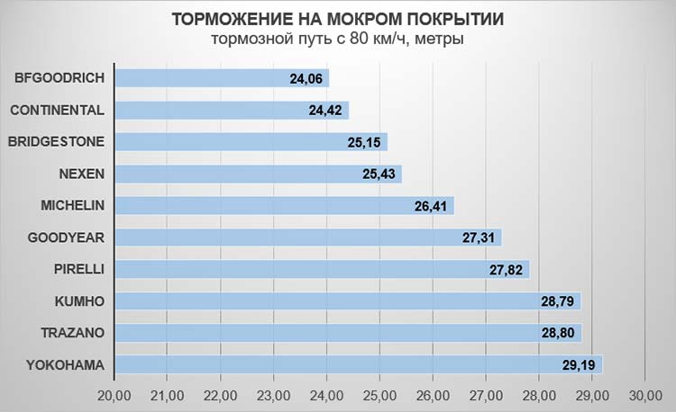 Тесты на эффективность торможения проводились в шведских городах Бьорквик и Йиславед с использованием Volvo XC40, и первое место по этому параметру заняли Continental, которые быстро останавливают машину и на сухом, и на мокром покрытии. Различия между шинами могут показаться не такими большими, но на самом деле на мокром покрытии тормозной путь BFGoodrich был короче, чем у Yokohama, на расстояние, эквивалентное длине автомобиля. Yokohama также заняли последнее место и на сухом треке, и кроме того явно слабыми тормозными качествами обладают бюджетные Trazano от крупной китайской компании ZC Rubber.